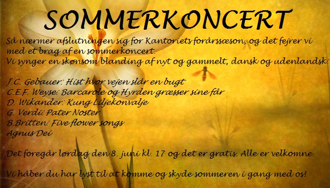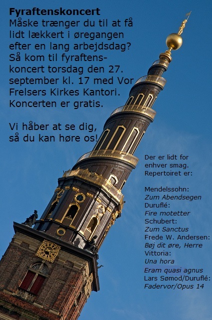 Tu es Petrus og Tantum ergo. Derudover Fadervor, også skrevet af Duruflé og arrangeret af vores egen organist Lars Sømod og til sidst en godnatsang. Den lille koncert, synger vi 3 gange i alt, kl. 22, 23 og 23.45. Og her behøver du ikke kulturpas.
